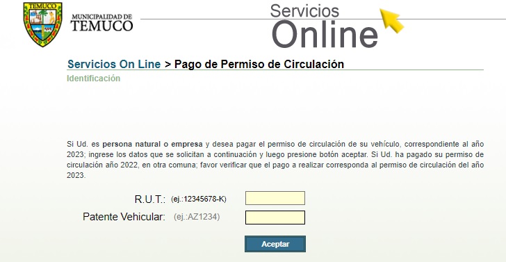 Como en Chile las municipalidades no tienen un sistema centralizado de información para la consulta y pago de los permisos de circulación, es necesario hacer una búsqueda primero para encontrar el portal de servicios indicado, en este caso, el de la Municipalidad de Temuco.