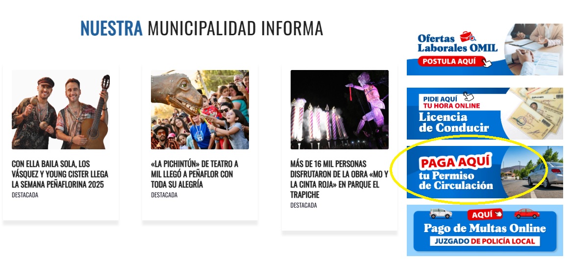 Para pagar online el permiso de circulación en Peñaflor solo debes tener un computador o celular con acceso a internet. Lo primero que debes hacer es ingresar al sitio oficial de la comuna y bajar por el sitio principal hasta que llegues a un botón de pago online, como muestra la imagen.